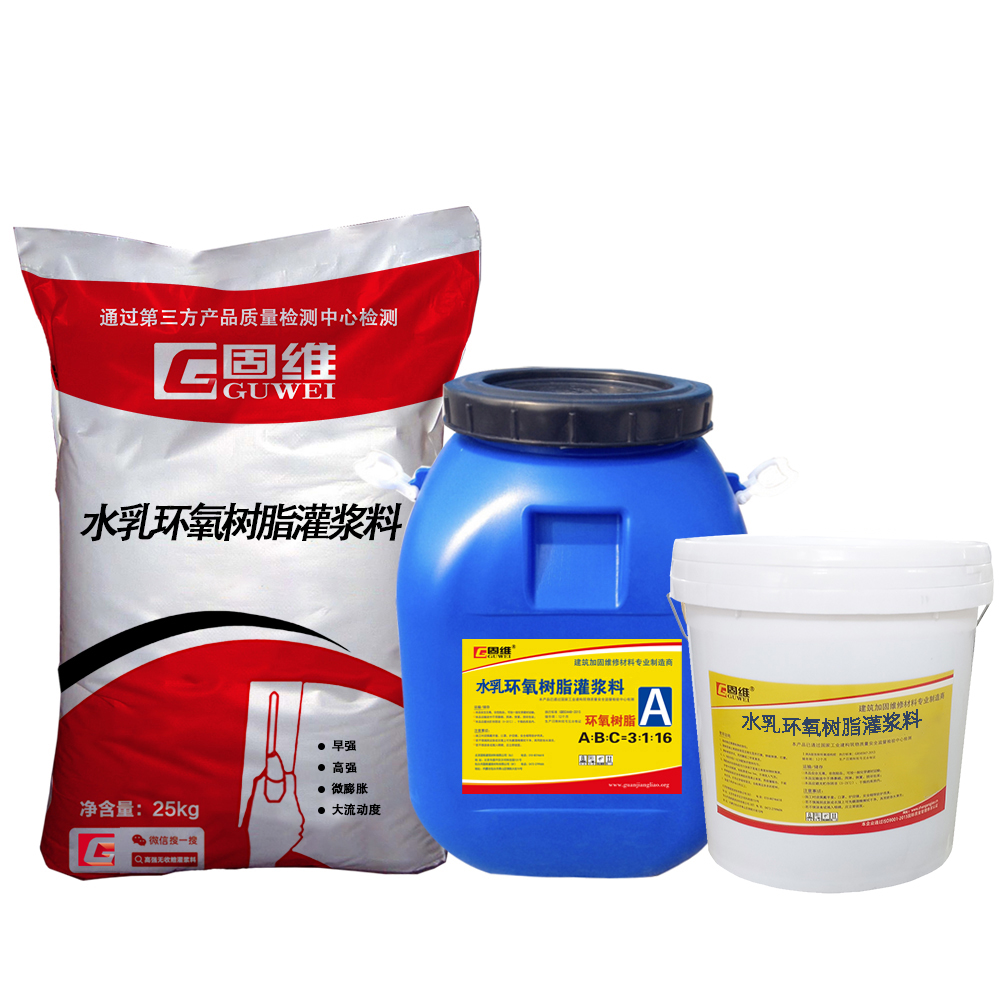 水乳环氧树脂灌浆料由水性环氧树脂,添加到水泥基灌浆材料中,通过水性环氧的交联固化及水泥的水化作用形成具有空间网状结构的高性能的农业生产体系—无机复合材料体系,起到增强、抗渗和抗化学品作用,可在潮湿界面和环境下快速固化,不产生龟裂,适应于水利、地下人防工程、道路桥梁等建筑物的缺陷修补粘结灌浆,亦可作防渗补漏材料。